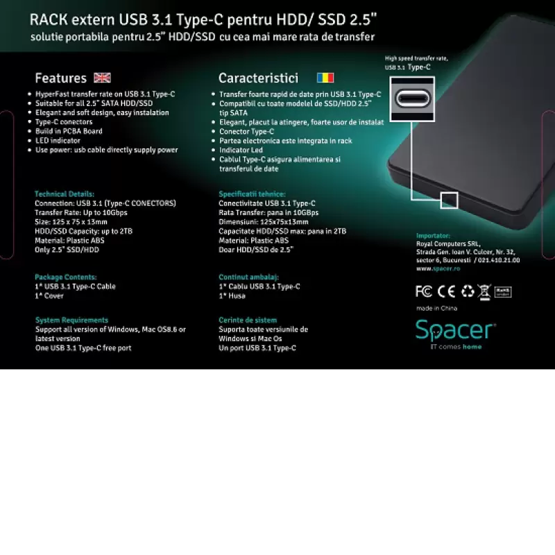 Rack extern Spacer, pentru HDD/SSD, 2.5 inch, S-ATA, interfata PC USB 3.1 Type C, plastic, culoare neagra , SPR-TYPE-C-01.