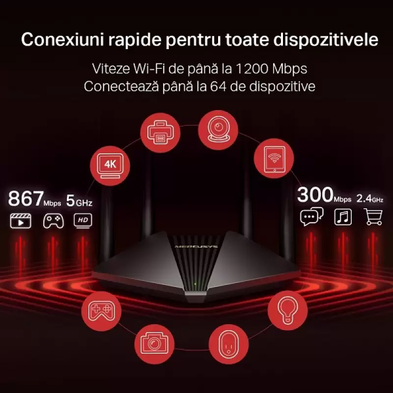 Router wireless Mercusys 1200Mbps, 2 porturi LAN Gigabit, 1 port WAN Gigabit, Dual Band AC1200 , 4 antene, MR30G .
